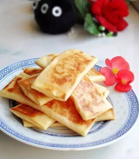 11.平底锅内放油,下入千层饼,小火将其煎黄一面之后翻面,最后煎至两面金黄中间熟透即可。