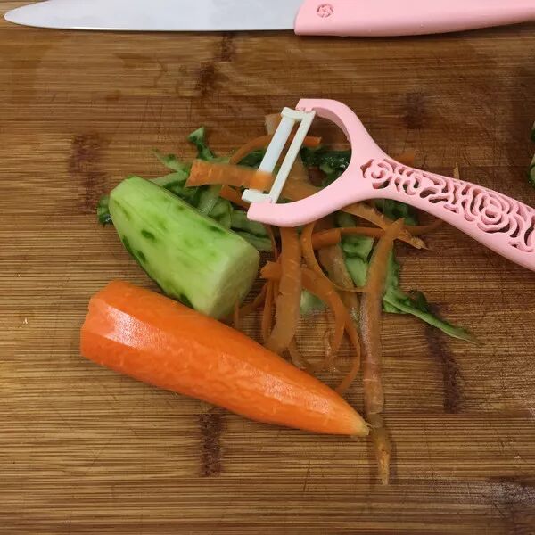 胡萝卜和剩下的一节青瓜洗净用刨子去皮。
