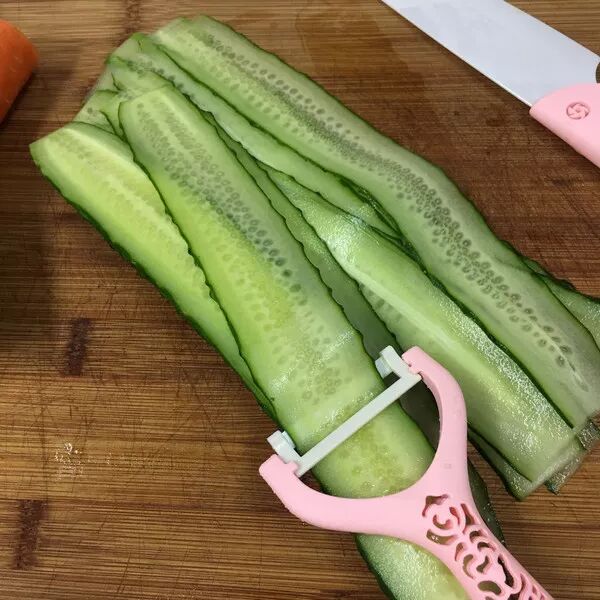 青瓜一根洗净,用奈瓷刀系列的刨子刨成薄片,刨子特别轻巧好用。