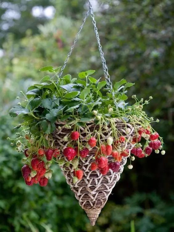 4、把它挂在光照充足的地方,定期浇水和施肥,不久你就可以看到红通通的草莓长满了整个吊篮。
