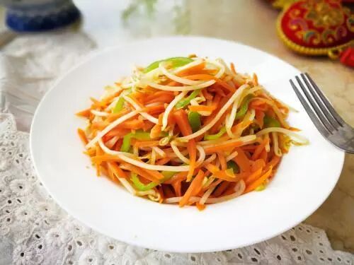 2. 胡萝卜切丝,小葱切段,蒜切片。开锅,小火,倒油,炒出蒜香。再倒入胡萝卜丝,翻炒,最后加入黄豆芽,适量盐继续翻炒。待豆瓣断生,下葱段炒匀后出锅。