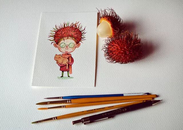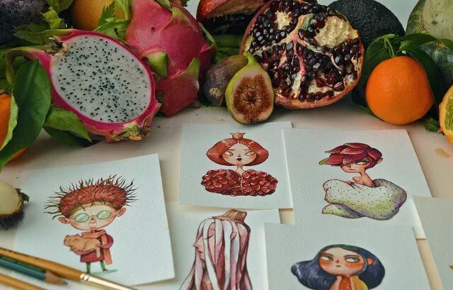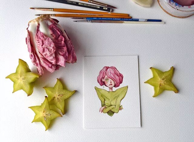 接下来,让我们来对比一下各种水果与英国插画家 Marija Tiurina创作的人物,看她是如何完美结合这些元素的: