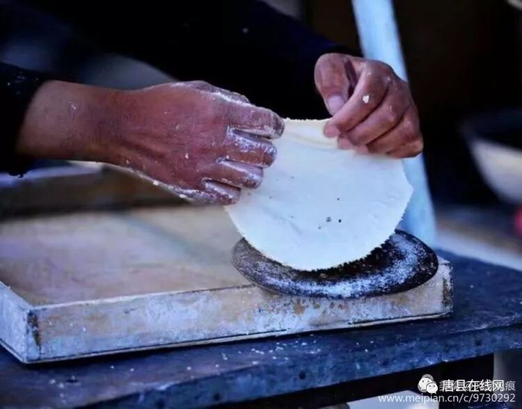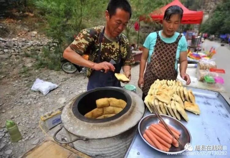 去唐县县城吃过几次烧饼,做工和川里烧饼不同,县城烧饼,下平上鼓,比碗口略小;中空,下层略厚,有硬荚;上层很薄,带有芝麻,色泽微黄;自一侧掰开夹层,里面塞上驴肉、香肠、焖子或是猪头脸等肉食;咬一口,好香!硬而能断,脆而不烂,香而不腻,干而不焦。