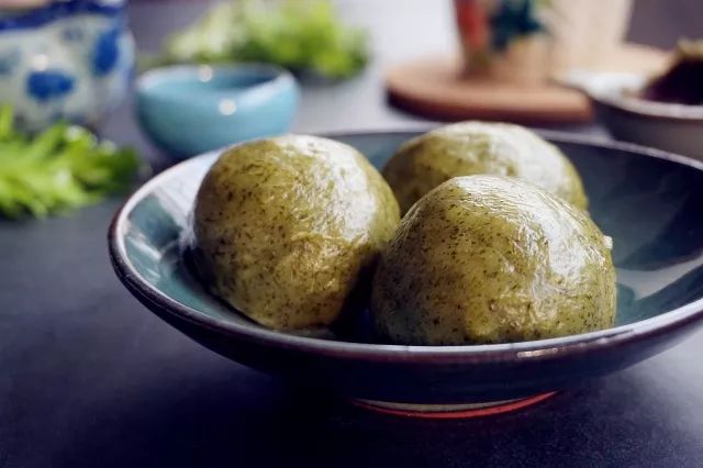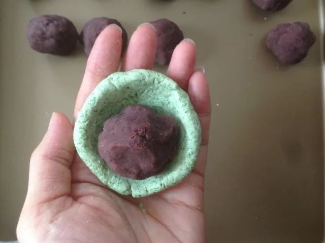 ⑦豆沙馅分成14个,每个20克,搓圆。艾叶粉团分成每个50克,搓圆后用拇指压成碗状,放入豆沙馅