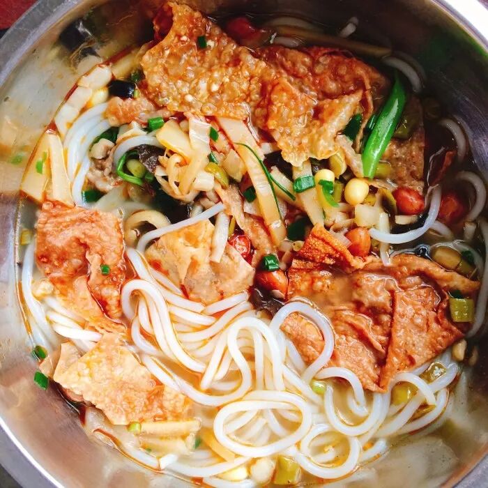 老板娘俯身从锅旁的锡桶中捞出泡得白亮柔韧的干米粉,投入装有沸水的大锅,长木筷飞快把粉打散,煮一阵子,挑起、拉长几根,对光,查看软硬。煮粉的空当,再把桶边的菜投入煮粉的锅里,烫七分熟,铺在碗底,搁点麻油,筷子头蘸盐抹在菜间,做完这些粉也好了,夹入碗中。老板娘端着碗,手中换上一大勺,指着锅前面一桌装着各种配菜的碗,“全部要?”“腐竹多点,要辣椒。”刷刷几下,葱花、萝卜干、酸菜、炸腐竹、木耳、花生米、酸笋被勺子扒拉到碗里;大勺子再往红锅里一探,搅动锅底的螺蛳叮当作响,琥珀色的汤汁捞舀进碗中;大勺子又轻掠过汤面上飘着的红油,片起半勺红汤,哗啦浇灌下去,引爆众食材的共鸣。