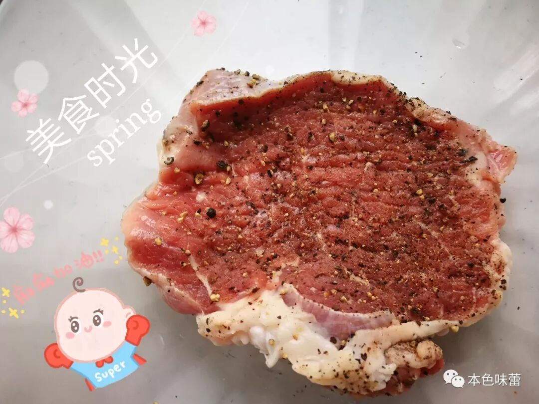 4.将吸干水分的牛排散少许盐、黑胡椒粉(胡椒粉要粗一点有颗粒状的比较好,煎的时候不容易糊)一起搅拌均匀,在牛肉两面抹上融化的黄油一起腌制3小时左右;