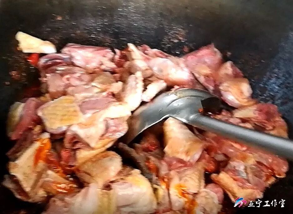 一只大公鸡约5斤左右。鲜嫩的鸡块加入锅中翻炒。