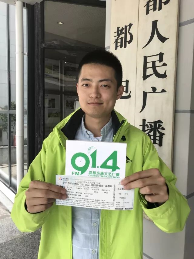 在上周五《畅行18点》节目中,我们随机抽取了一位参与节目互动的幸运听众,赠送了两张李宇春“流行”演唱会成都站门票!