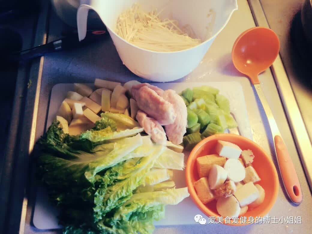 2.将土豆,青笋和丸子一起下入沸水中,开大火煮8到10分钟,使其8分熟后捞出备用,然后再加入金针菇,煮2-3分钟捞出,最后放入鸡翅,煮8分钟左右捞出备用。