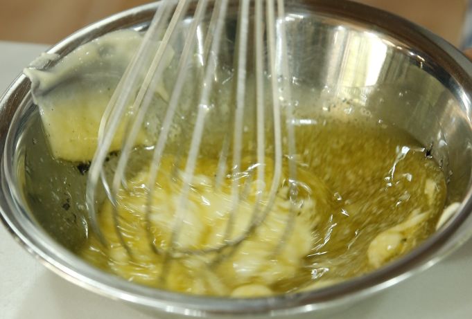 4.分次将打发的蛋白与打发的“步骤2”混合。