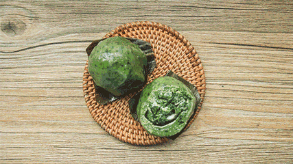 青团是把一种名叫“艾草”(或麦青)的野生植物洗净煮烂挤汁,揉进糯米粉内,做成一只只青团子。青团油绿如玉,糯韧绵软,清香扑鼻,从色彩到口感都带着春天的气息。