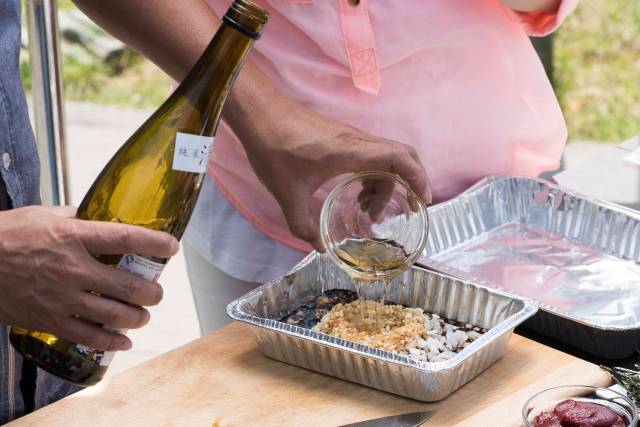 将150g酱油、100g味淋、50g清酒依次倒入装有蒜末和洋葱的锡箔盒中。