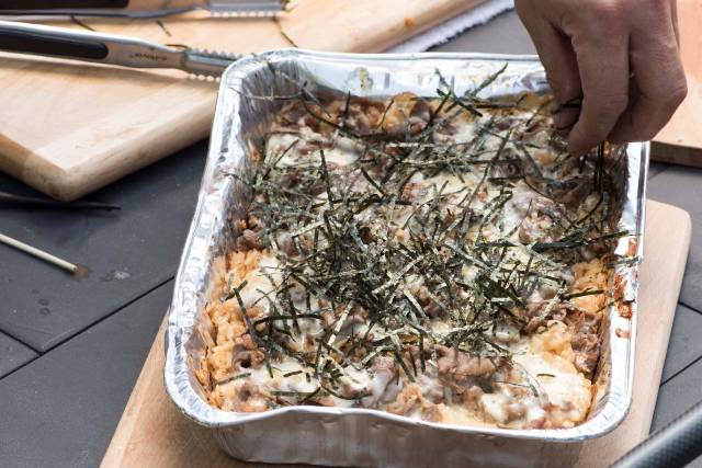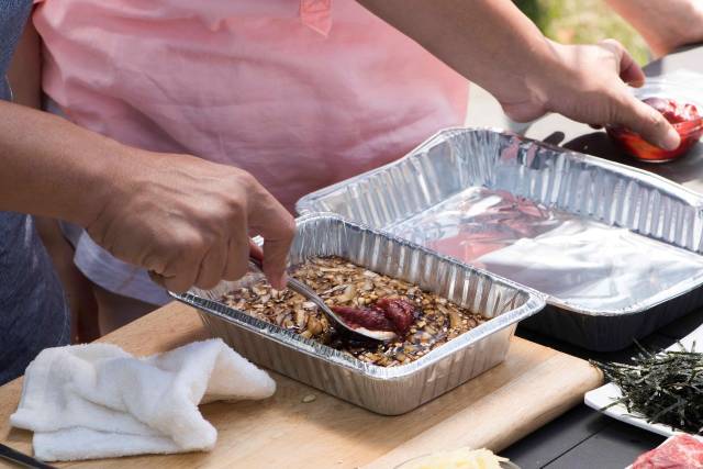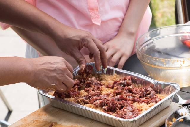 用锡箔盒来做烧烤料理,是我在加拿大得到的灵感。在和当地人BBQ时,除了直接火烤食材外,他们也会把烤台当成加热源,把厨房里的锅放到烤台上来烹饪食材,这让我想到台湾的铁板烧,也会利用锡箔盒来烹饪。今天我会结合这两种烹饪方法,在烧烤台上做一道牛肉炖饭,会有意想不到的惊喜哦。