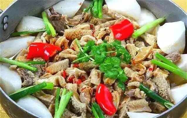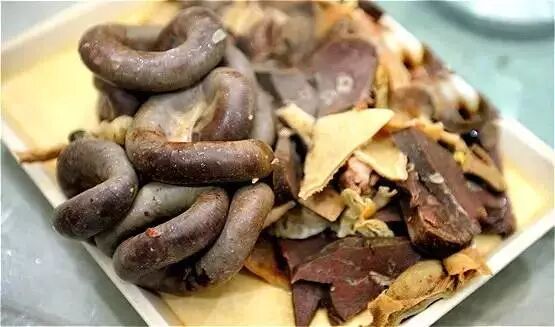 羊杂碎——蒙古族的羊杂碎在诸小吃中占有至高无上的地位,讲究“三料”、“三汤”、“三味”。三料又分为主三料和副三料。主三料即心、肝、肺,又称“三红”;副三料即肚、肠、头蹄肉,又称“三白”。