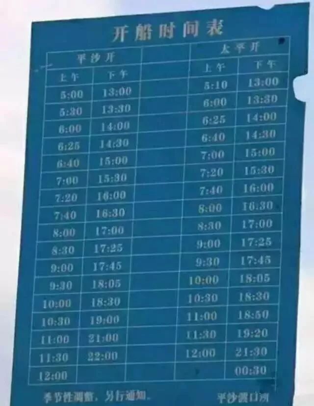 1、平沙<=>西樵太平:3艘渡轮对开半小时一趟,人流量大满客即开。开船时间:西樵5:00-23:00;
