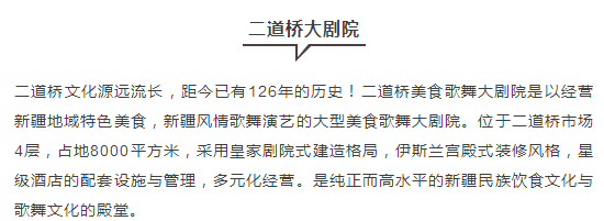 新疆大剧院位于乌昌交汇处屯河西岸,总投资达12亿元,占地面积280亩,总建筑面积10万平方米。以新疆大剧院为主体,包括丝绸之路文化艺术研究院、丝绸之路博物馆、丝绸之路文化展示长廊、音乐厅、会议中心、文化艺术培训中心及旅游推广中心等相关配套设施,是一个集文化、演艺、旅游、休闲于一体的大型文化景观建筑。在新疆大剧院还可观看大型室内实景民族歌舞秀《千回西域》。