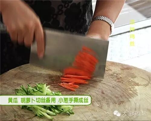 所需食材:去皮鸡腿肉、花椒、香叶、胡萝卜、黄瓜、香葱、辣椒面、酱油、醋、食盐、白糖、芝麻