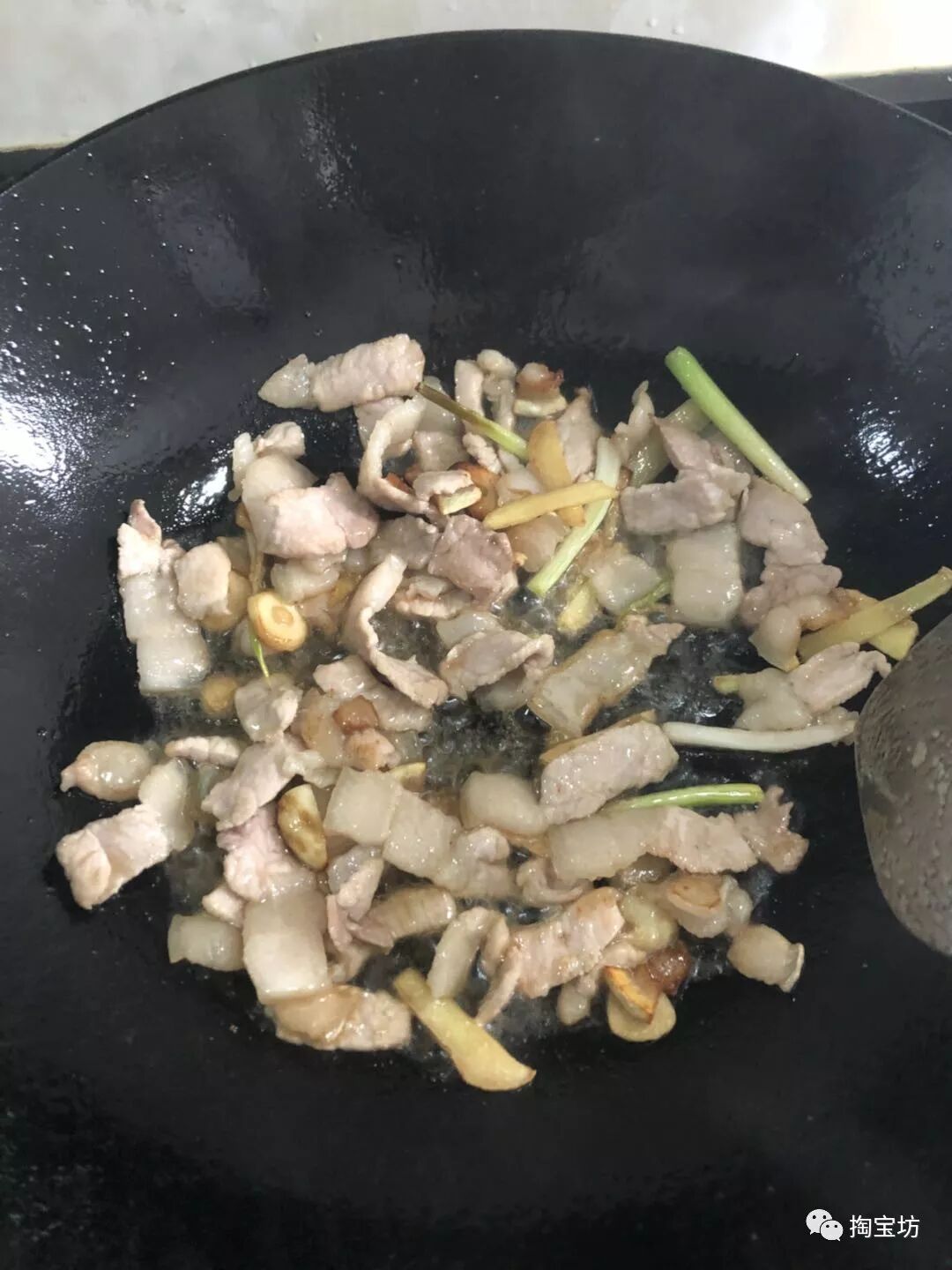 爆香以后把肥瘦相间的肉丝放进去,爆炒。