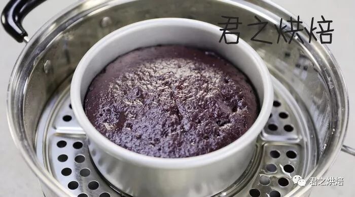 7、将米浆倒入一个6英寸的蛋糕圆模里(如果是非防粘的模具,内壁要涂抹一层植物油或黄油防粘)。蒸锅里倒入水并加热,加热到水开始冒热气就可以关火了。将模具放入蒸锅里,盖上锅盖,发酵40分钟左右(蒸锅加水烧热可以创造一个温暖的环境,有利于发酵)。