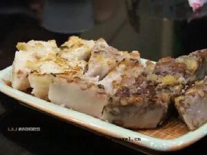 起糕,威海著名小吃。把薯面放于瓦盆中,细细洒水,反复搅拌,和匀后放锅内大火蒸,切成方块吃。由于太好吃,吃得快,容易噎人,故又称"噎煞狗"。一般要配着稀饭食用。威海小饭馆内2-3元一块。