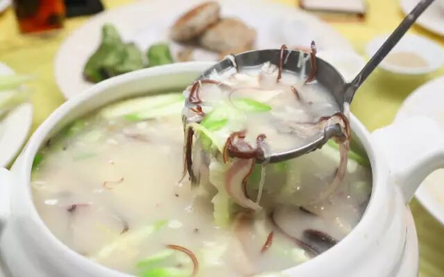 这是顺德人食鱼八法之一--拆食的典型菜例。把鳙鱼稍煎,拆骨取肉,与木耳丝、胜瓜丝、冬菇丝、陈皮丝、炸粉丝、柠檬叶丝等同烩成羹,起锅时撒上榄仁、葱花和生磨胡椒粉。羹呈乳白色,口感鲜美,层次分明,味道丰富,气味芳香浓郁,是一道深受欢迎的地道的传统菜式,在广东一带颇具名声,尤以顺德烹制的此道菜响誉海内外。