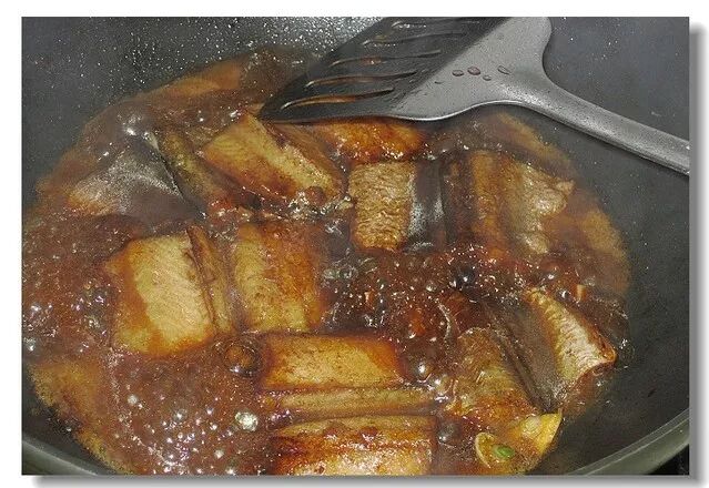 都煎好后用锅内的底油把花椒葱姜蒜煸香,倒入鳗鱼,加糖