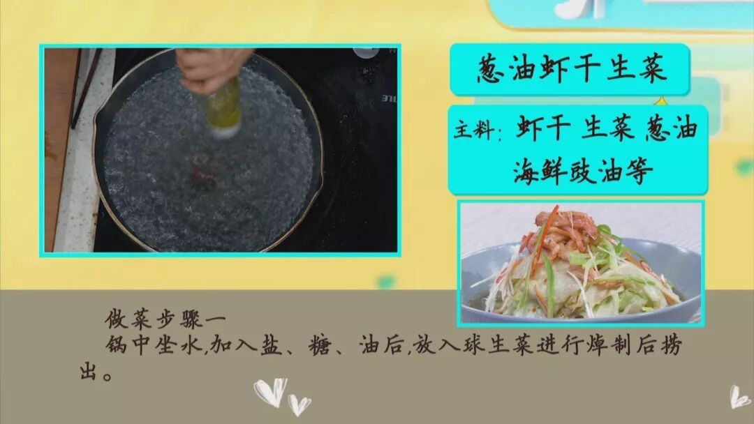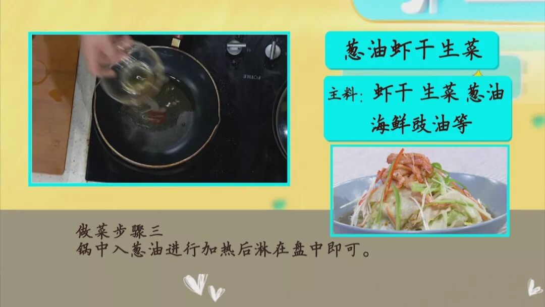锅中入葱油,油热放入虾干进行炒制后缀入生菜盘中,再分别倒入豉油,加入葱丝、青红椒丝。