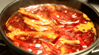 脑花儿弄得相当嫩气,拈的时候要小心。不怕辣的可以在里面多huo一转,辣到冒汗。