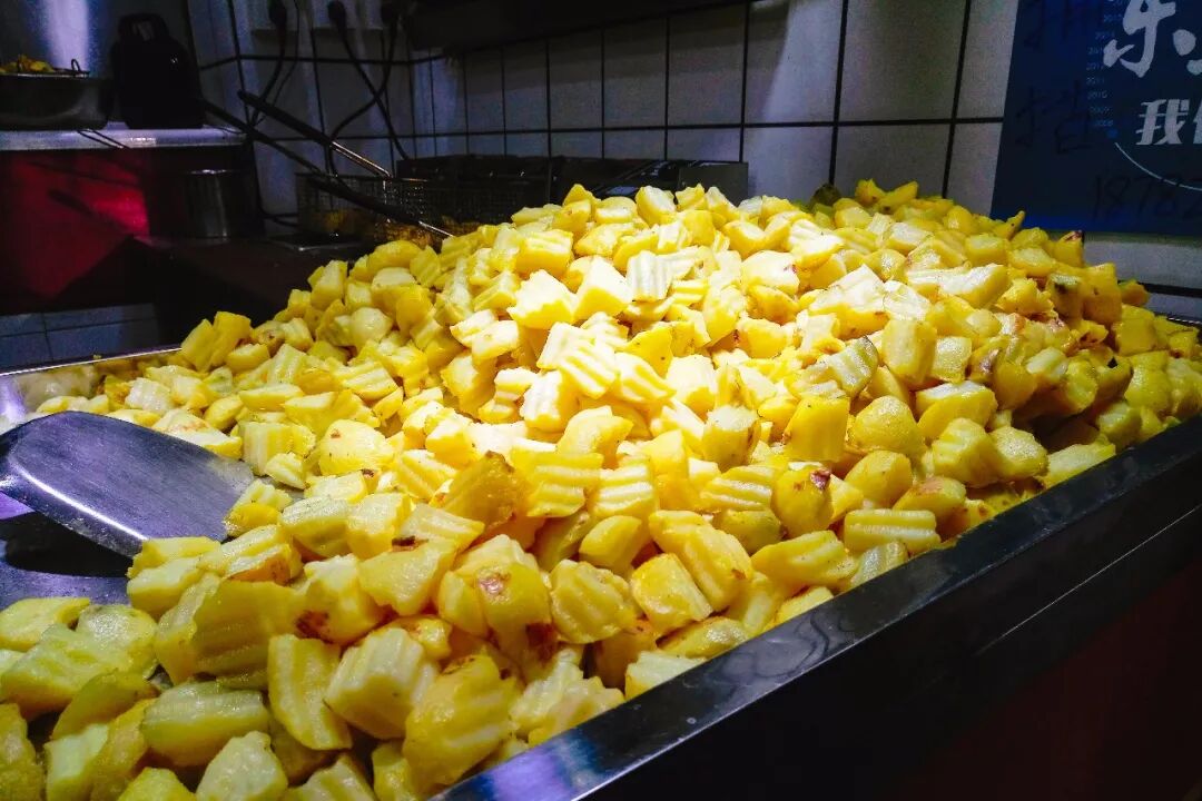 来到这个十字路口,最好找的店就是周签签土豆——队排得最长的就是它!不开全景模式都拍不完这个队伍,土豆真的能有这么好吃?