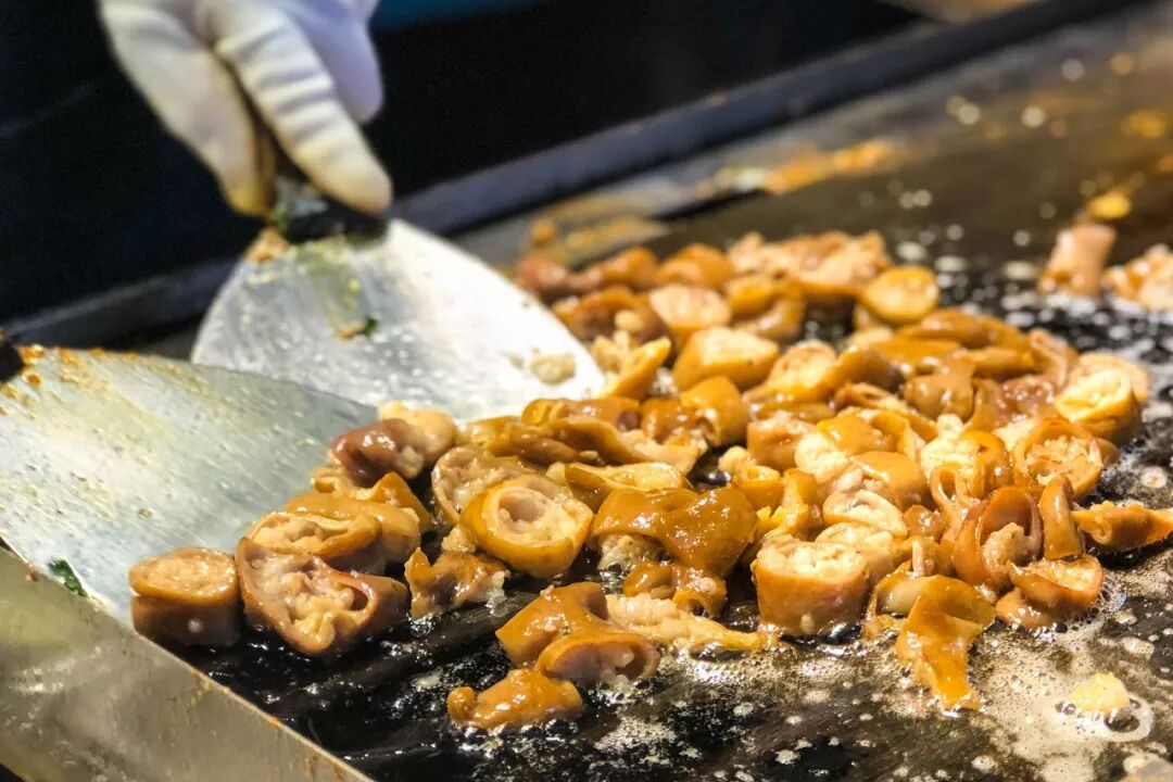 店员在铁板上翻炒肥肠的时候,小编还在想,嚯哟,全吃烤肥肠会不会有点腻啊…一个个油爆爆的,泛着油花,爱吃也经不起这么扎实的吃法。