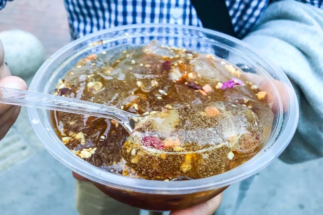 实打实的手搓冰粉,里面的小气泡清晰可见。而且玫瑰味也是十分浓郁。冰粉滑溜地进了肚子,香气却一直萦绕在口腔,久久不散。
