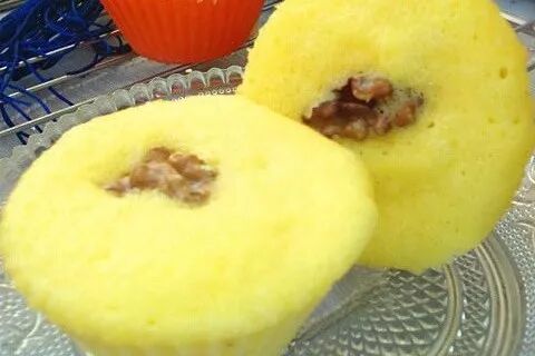 微波蛋糕粉 100克 / 鸡蛋 2个 / 玉米油 10毫升 / 核桃仁 适量 /
