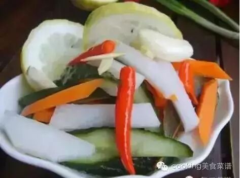 原料:白萝卜、红萝卜、黄瓜、柠檬、姜、大蒜、白糖、白醋、盐、小尖椒、香叶、水