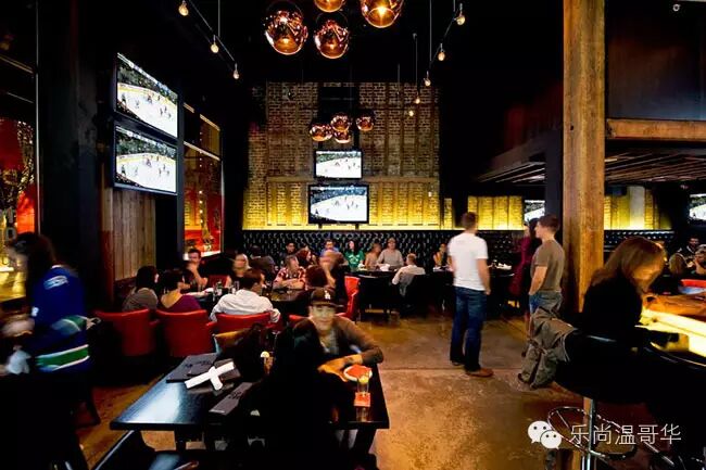 温哥华最早的体育酒吧之一,12英尺媒体墙、60台电视。酒吧本身风格奢华安逸、设计高雅、厚重的皮革卡座。 Double cheese nachos、mini mac sliders and steak sandwiches都是不错的选择。