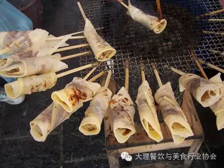 烤饵块是云南大理当地的一种民俗小吃。是用煮熟的大米饭压成块状,通常是圆形薄饼状。在炭火上面烤制,然后涂上酱料和菜陷即可。大米的清香搭配酱料的风味,是云南人民普遍喜爱的食品。