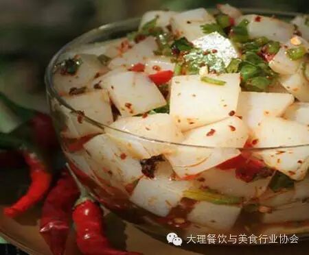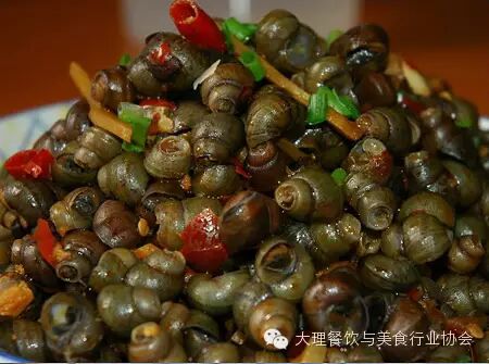 大理洱海特产螺蛳,白族喜食螺蛳,吃法有多种多样,其中腌螺蛳就是一种独特的吃法。清代檀萃在其中名著《滇海虞衡志》中,说:“滇嗜螺蛳已数百年矣……以姜米、秋油调、争食之立尽,早晚皆然”。另据〈〈本草纲目〉记载:“螺蛳处处湖溪有之,江、夏、沔尤多。大如指头,而壳厚于田螺。憔食泥水。春月,人采置锅中蒸之,其肉自出,酒烹糟煮食之。”腌螺蛳的食法是:取鲜活螺蛳,去壳,洗净后,用沸水浸泡片刻,捞出滤水冷却后,拌以酸辣调料后即可食用。此时的脆螺蛳有酸、辣、香等味,别具风味,是一道白族喜欢吃的凉菜。