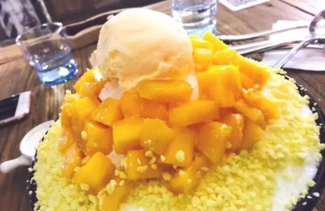 膨膨冰保利广场店的环境相当不错。他家的绵绵冰超大一份的,大份估计三四个人吃差不多。情侣档或者闺蜜档两人来份小份的就够了。人气菜品芒果膨膨冰雪花冰料很足,芒果、膨膨冰、水果、奶油,吃起来有种透心凉的感觉,顶上一颗芒果冰淇淋球也是分量十足。其他带年糕的款式别怪小编没提醒你,绝对顶一顿饭。