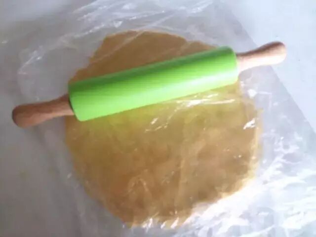 5.将硅胶垫上铺上保鲜膜,放上面团再铺上保鲜膜,擀成半厘米厚度的面片,然后用心形模具压出形状,放入烤盘。