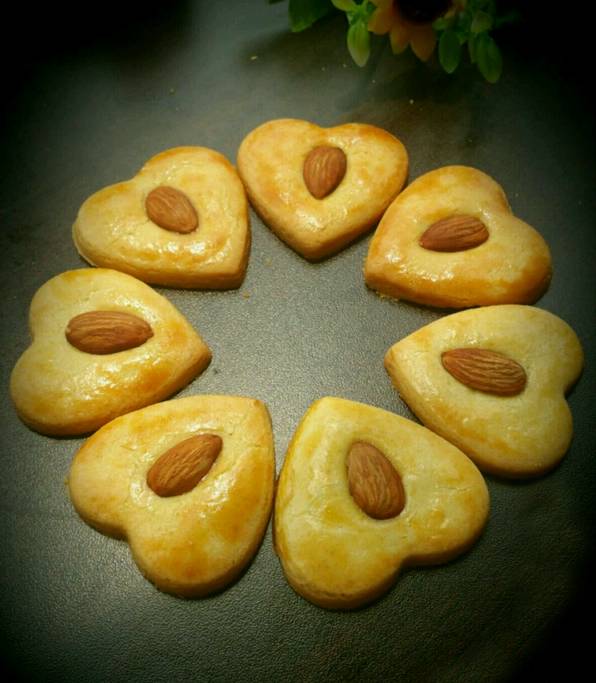 6.刷上一层蛋液,放上杏仁,杏仁尖头和心形尖头一个方向。