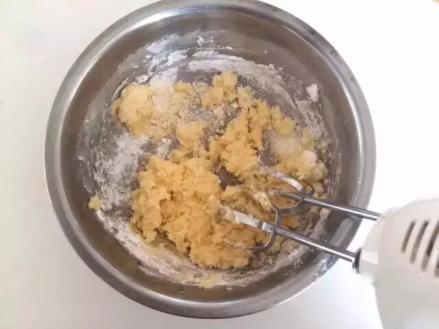 3.分次加入鸡蛋液,并搅拌均匀。(鸡蛋液不要加完,留下一点刷蛋液用)