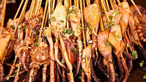 烤鱿鱼是中国有名的街头烧烤。将整条鱿鱼或鱿鱼丝穿成串,加入辣椒等配料进行烧烤,便制成了这道美味食品。鱿鱼的营养价值很高,具有高蛋白、低脂肪、低热量的优点,是优质的海产品。