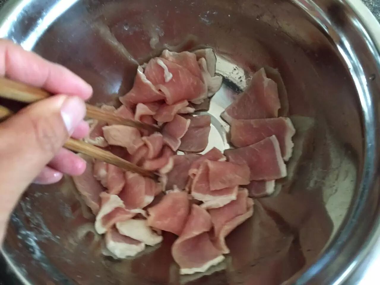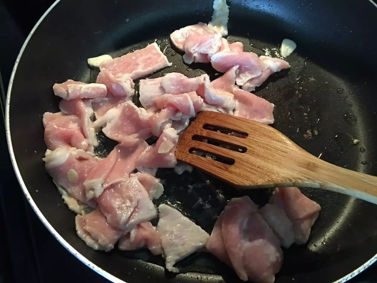 将锅烧热后下油,七成油温后放入肉片煸炒熟肉片后取出备用