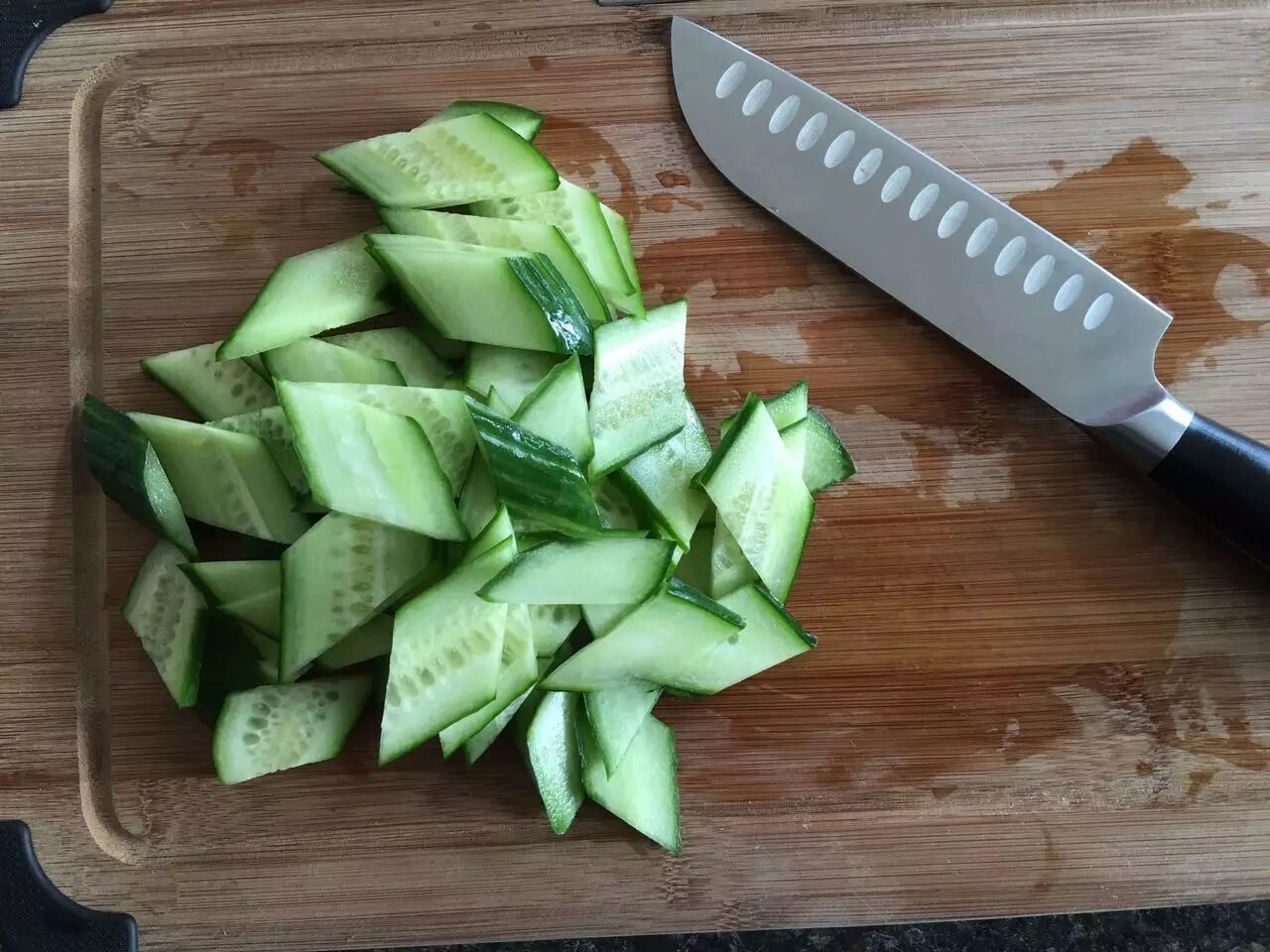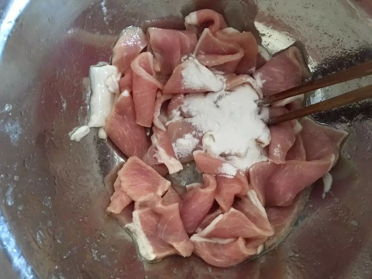 将300g肉切成薄片,放入料酒、盐、生抽腌制10分钟左右,腌制完成后放入蛋清、淀粉少许,挂糊;将配菜黄瓜切成片