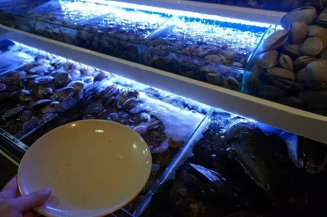 当然来这里还是首选贝类啦~他们全部都放在水族箱内等你去夹~
