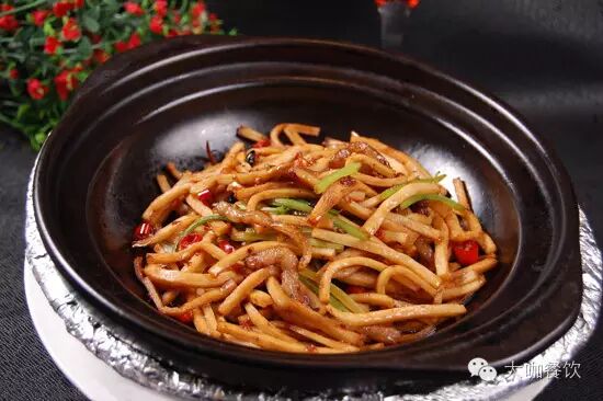 3、另起净锅,放入色拉油5克,入肉丝炒散,下入杏鲍菇,烹入B料,下红椒节和香菜梗,出锅装在烧好的沙锅内焗制1分钟即成。