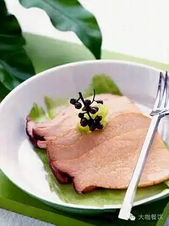 3、凉瓜切薄片置于盘中,烧好的杏鲍菇放在凉瓜片上,摆一串青花椒装饰即可。