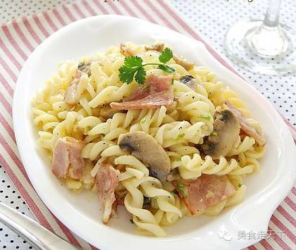 材料:意大利面,培根,口菇,奶酪粉,鸡蛋黄,黄油,高筋粉,水,牛奶,盐,鸡精,白糖,橄榄油,蒜末,奶油白酱,鲜奶油,香菜末