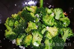 放入1勺盐、半勺鸡精调味,出锅前再将另外一半的蒜末放入锅中翻炒匀均。