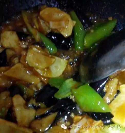 4.锅内留少许底油,放入辣椒、姜末拌炒,再往锅中倒入茄子、土豆和其他调味料,淋入淀粉,勾芡盛起即可。