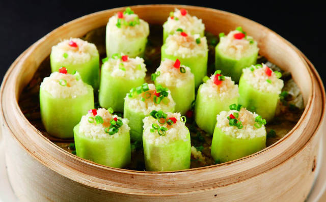 4、再将扇贝蓉酿入丝瓜块里,同时,在每个扇贝蓉上,加入少量的马哈鱼籽。